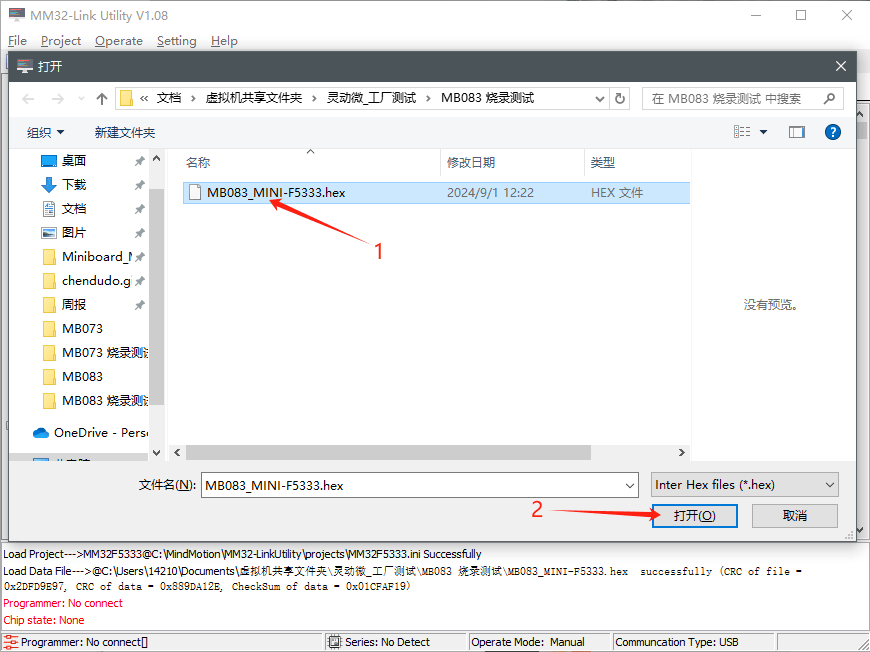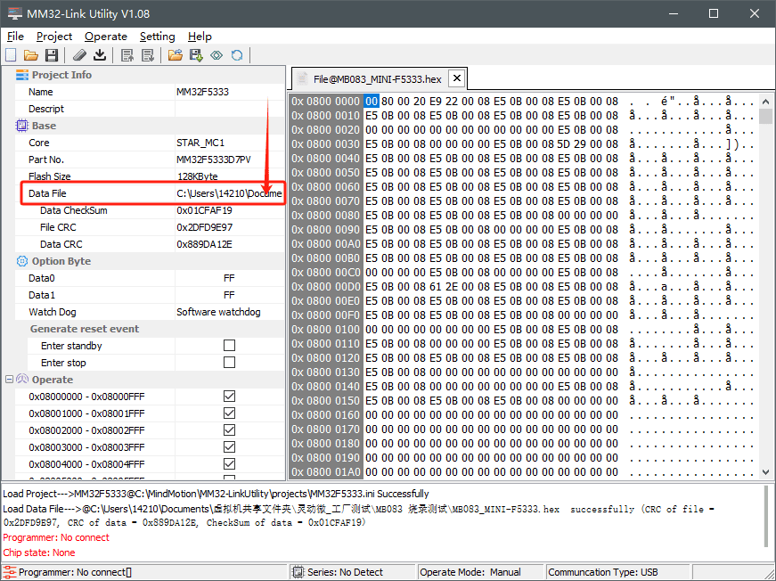注意,图中的“Data File”烧录文件在第一次运行时,由于路径变动可能需要文件路径,双击上图中的红色区域,修改至本地测试文件夹MB083烧录测试\MB083_MINI-F5333.hex。示意如下:
