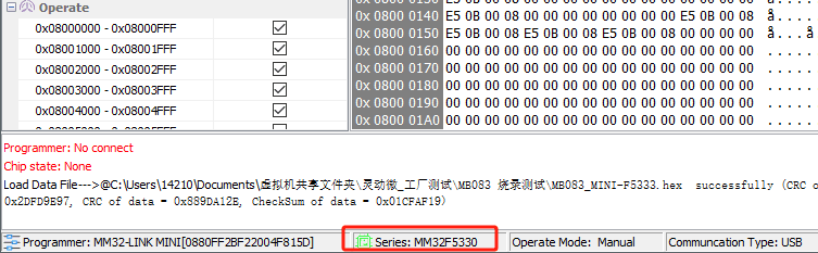 MM32LINK Utility 软件下方状态栏 Series 出现绿色图标,并识别出MM32F5330即可。如图所示: