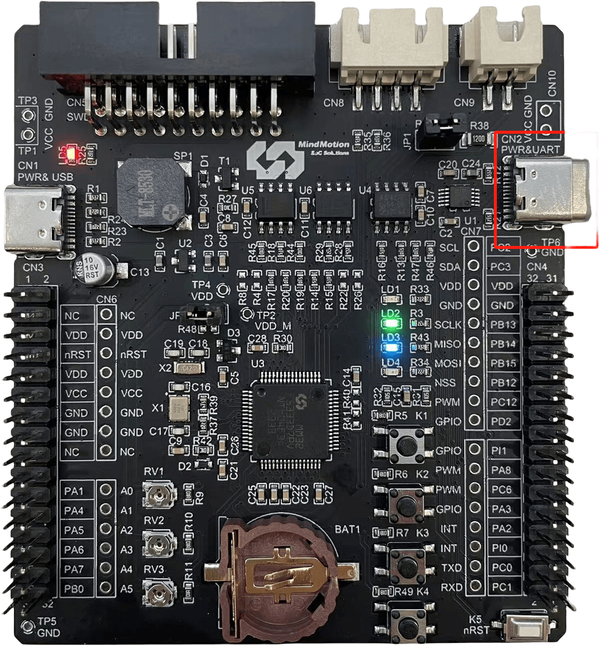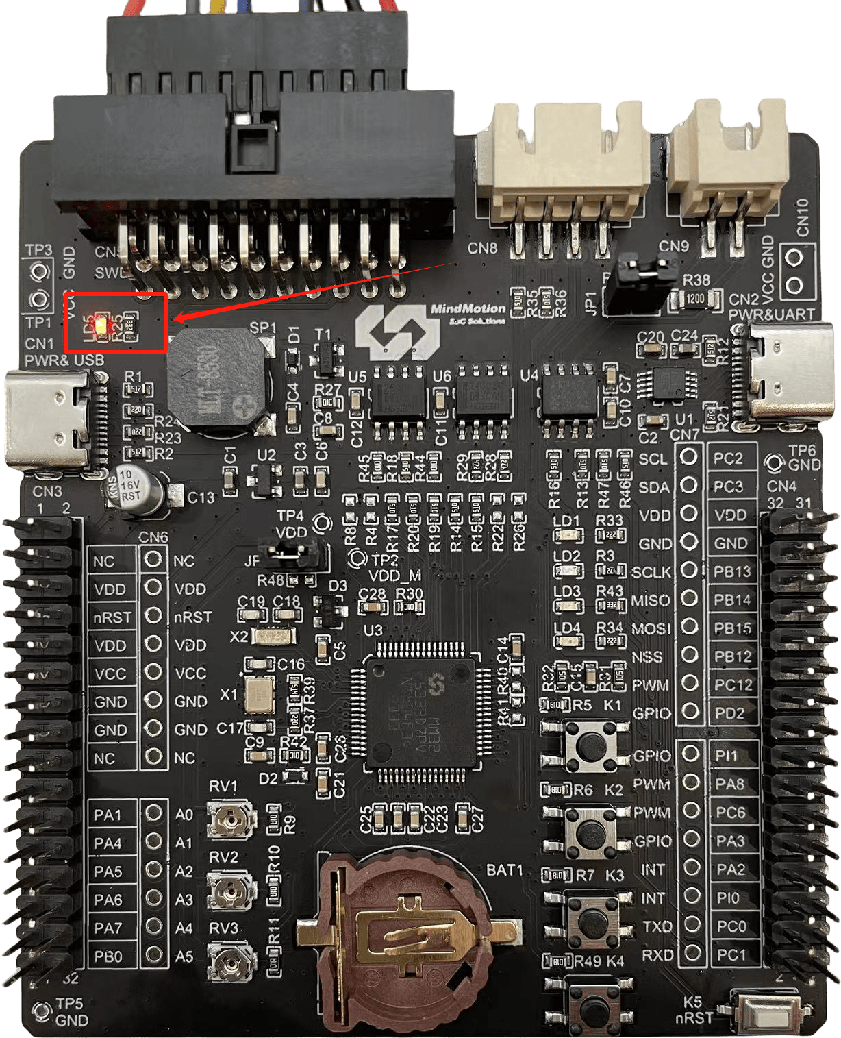 拔掉 MB083 与 MM32LINK 的连接。测试工装提供的 Type-C线缆 请插入MB083右侧CN2口,另一端连接电脑。