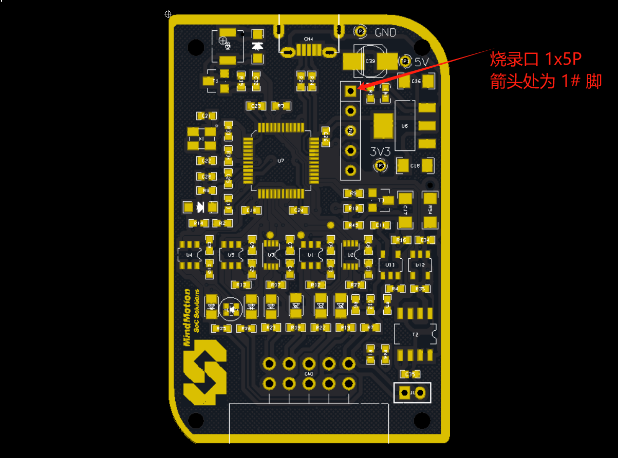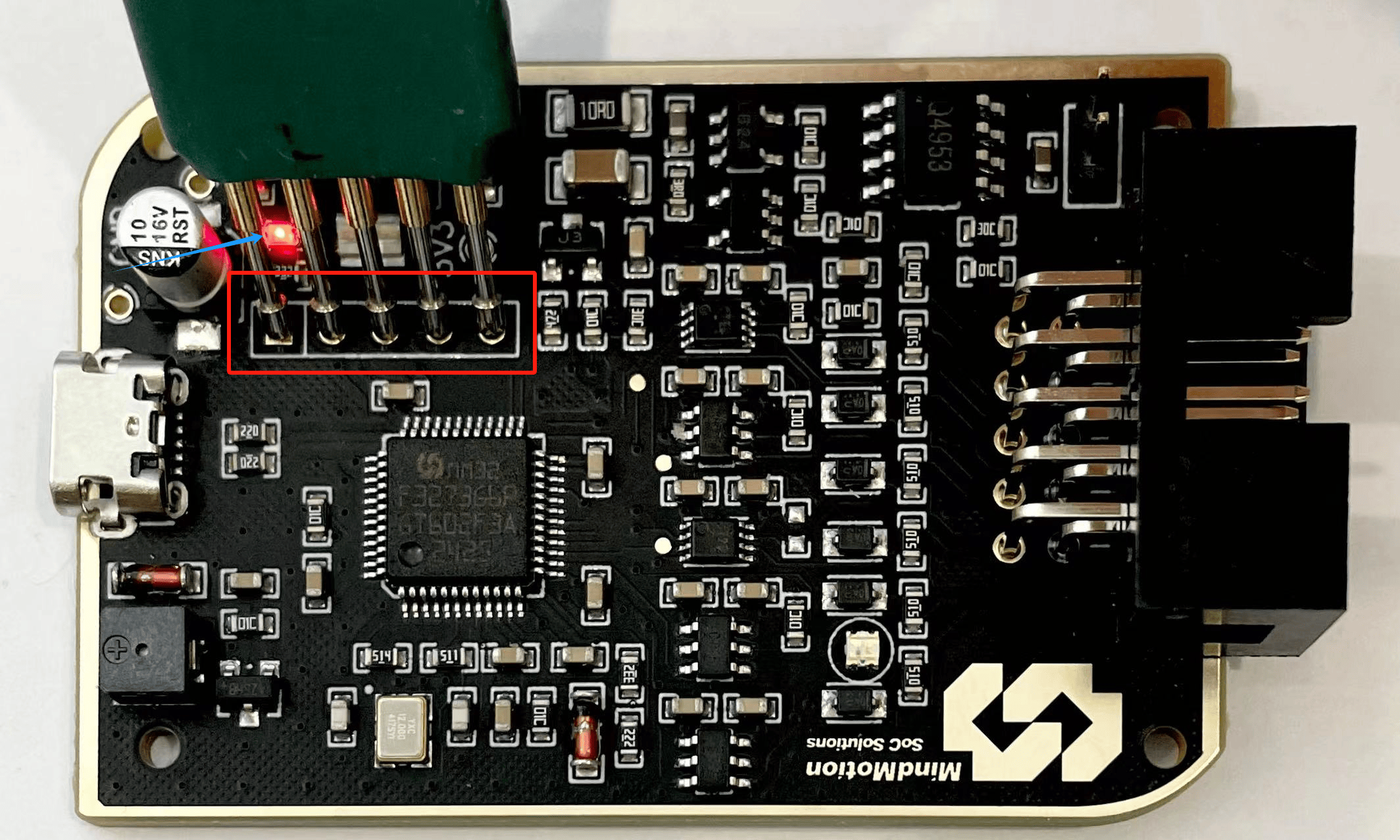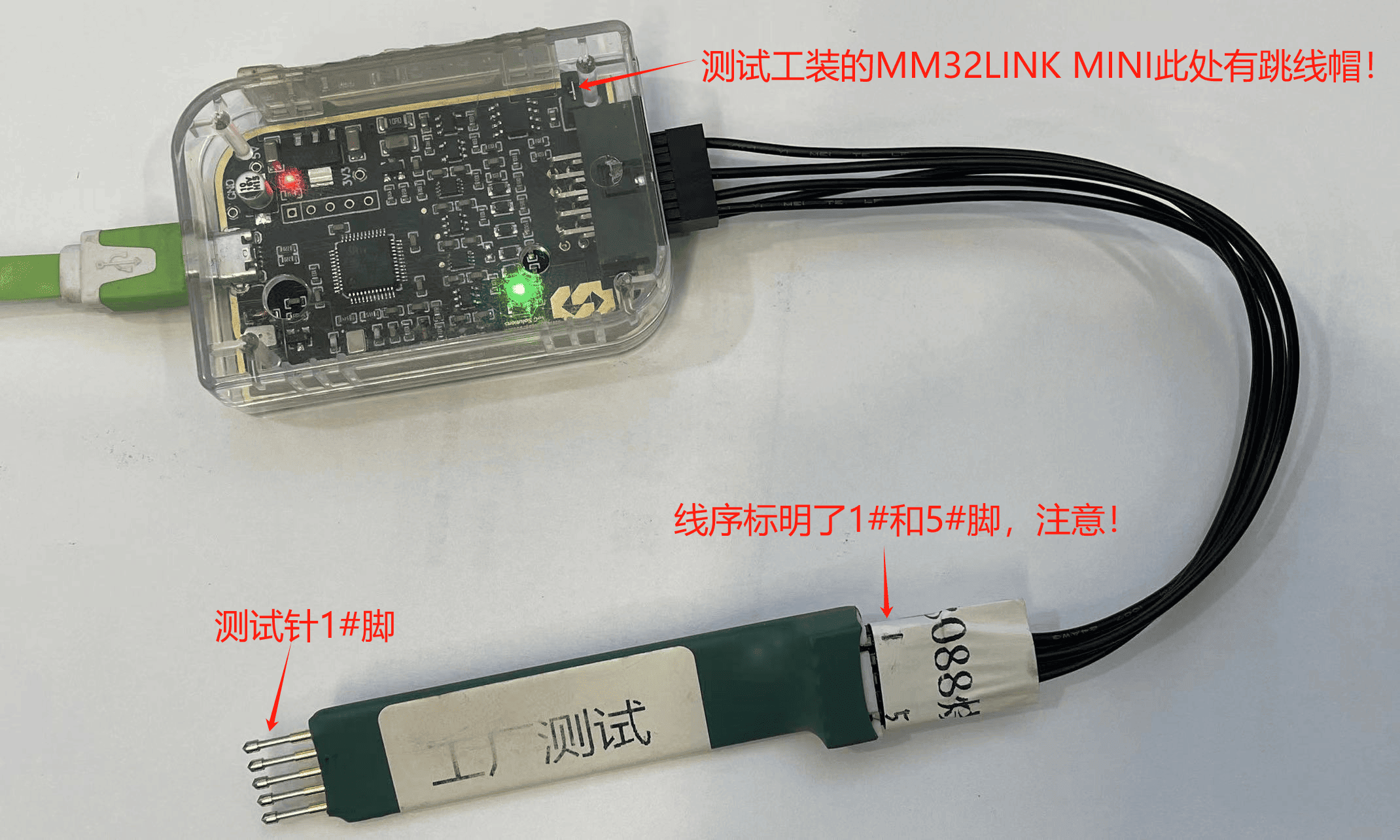 使用提供的工装MM32LINK-MINI连接至待烧录的 MB088 烧录口,1x5P测试探针对应至下图中的1#脚。