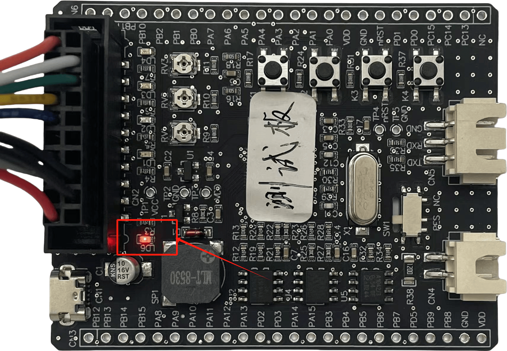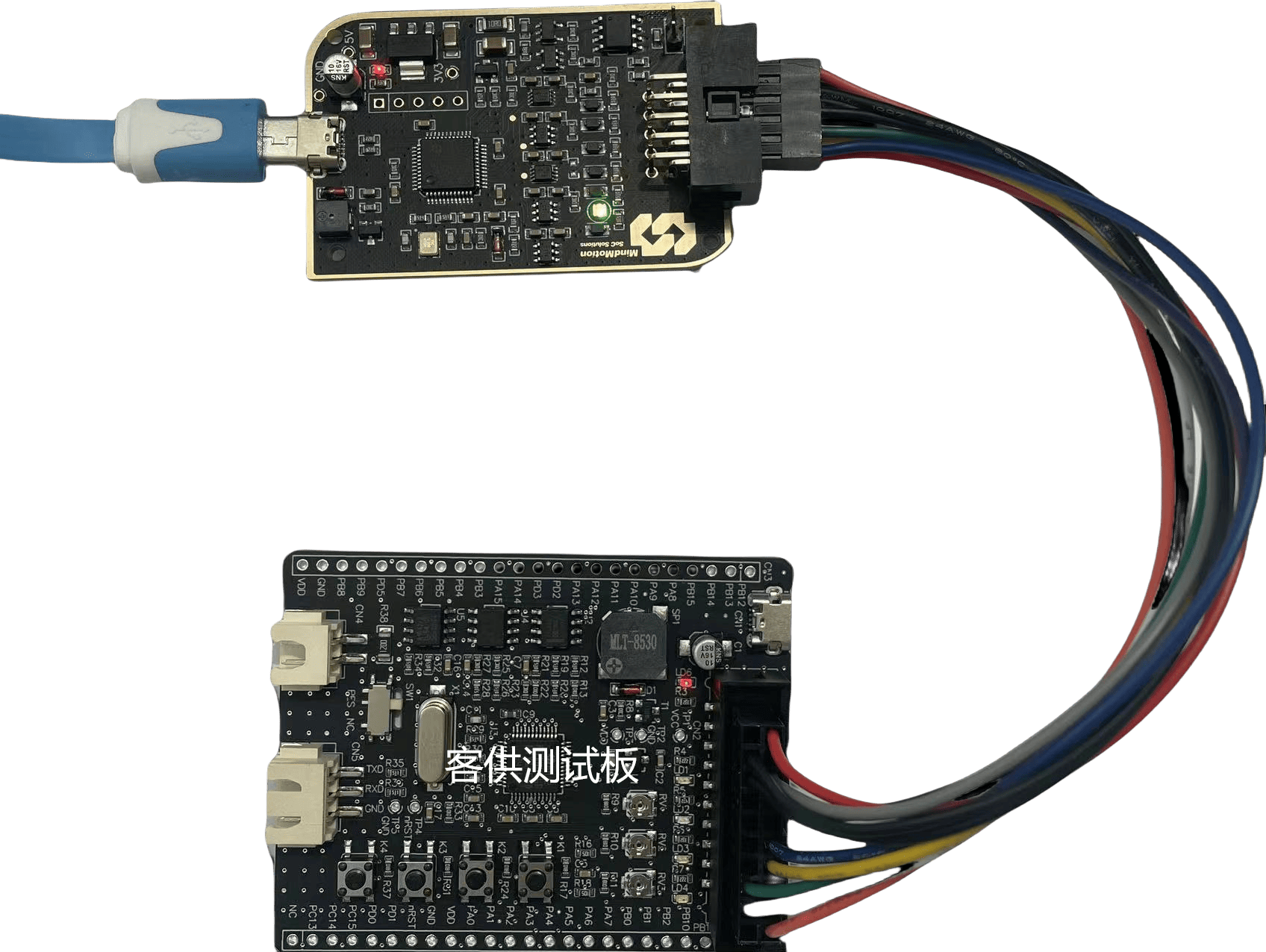 配套 2x5P 线序(两端子)分别连接至 MB088 和客供测试板,由于 MB088 默认提供 3.3V 电源输出,客供测试版电源指示灯(LD6)亮。如下图所示: