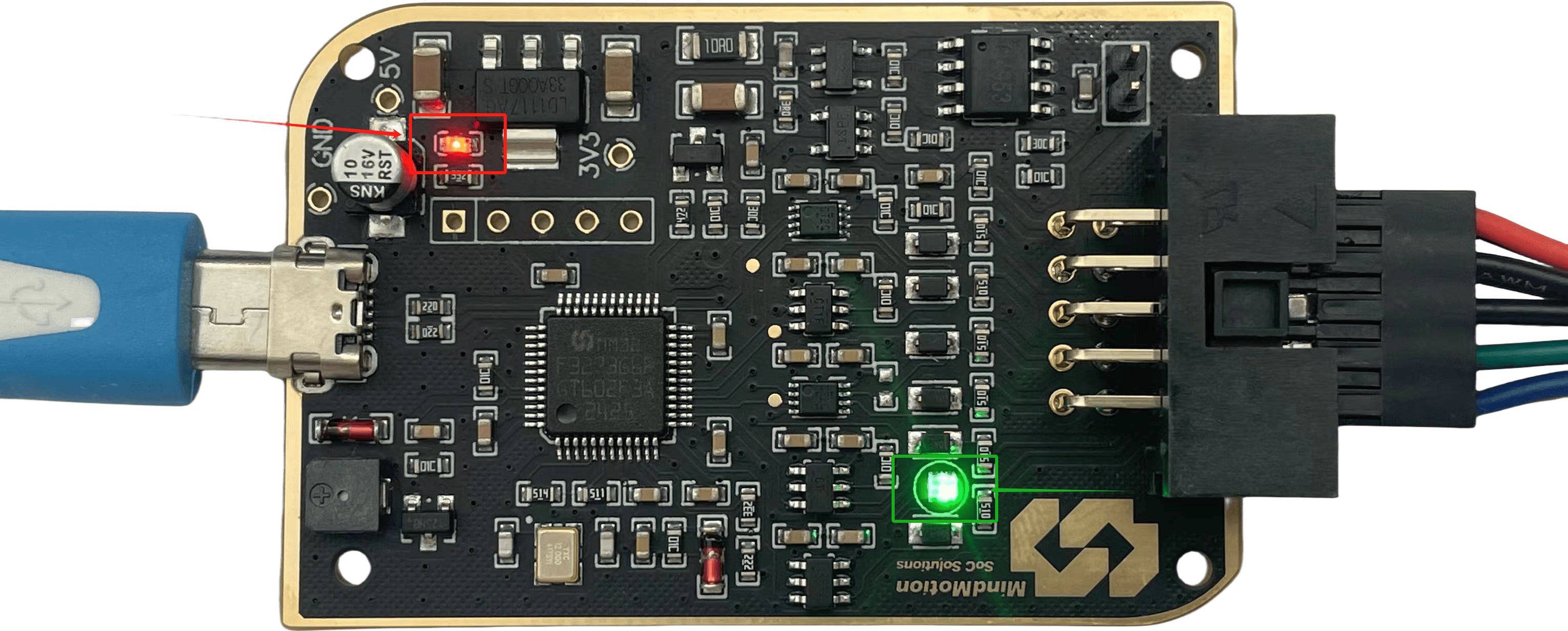MB088 通过配套蓝色 Micro-USB 数据线连接至计算机,MB088 红色LED灯(图示红框)亮,刚上电时绿色双色灯(图示绿框)会有闪烁。如下图所示: