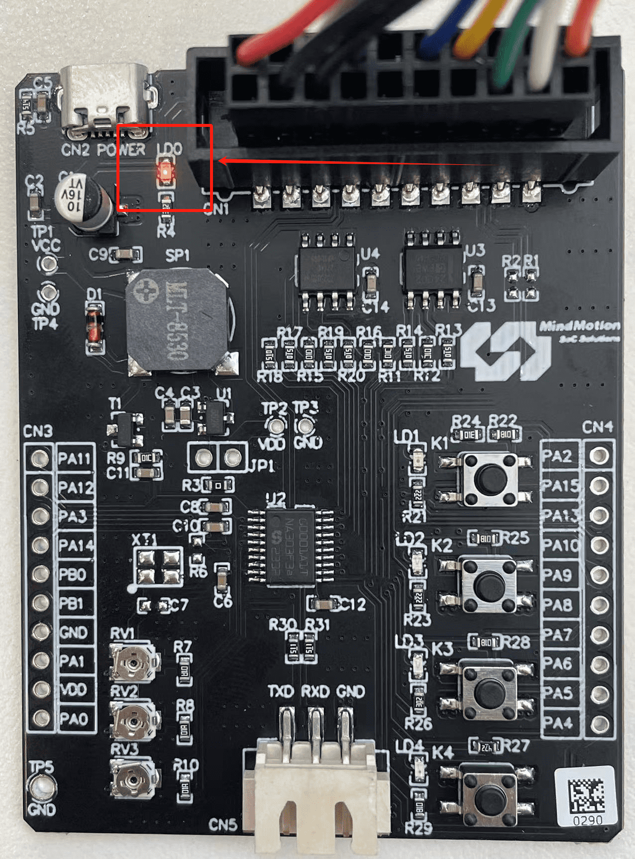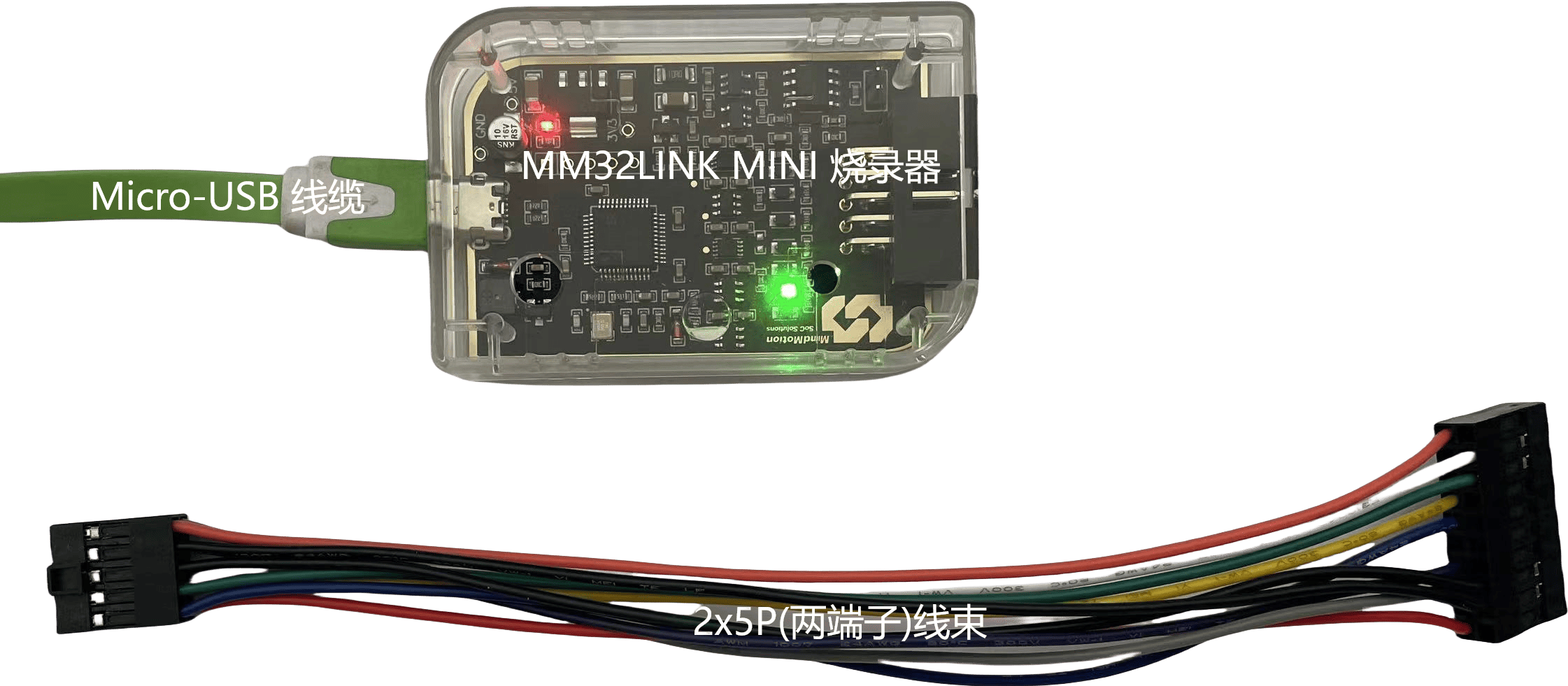 待测试 MB091 与烧录器 MM32LINK MINI 保持连接, 或由Micro-USB(CN2)连接5V电源供电即可。
